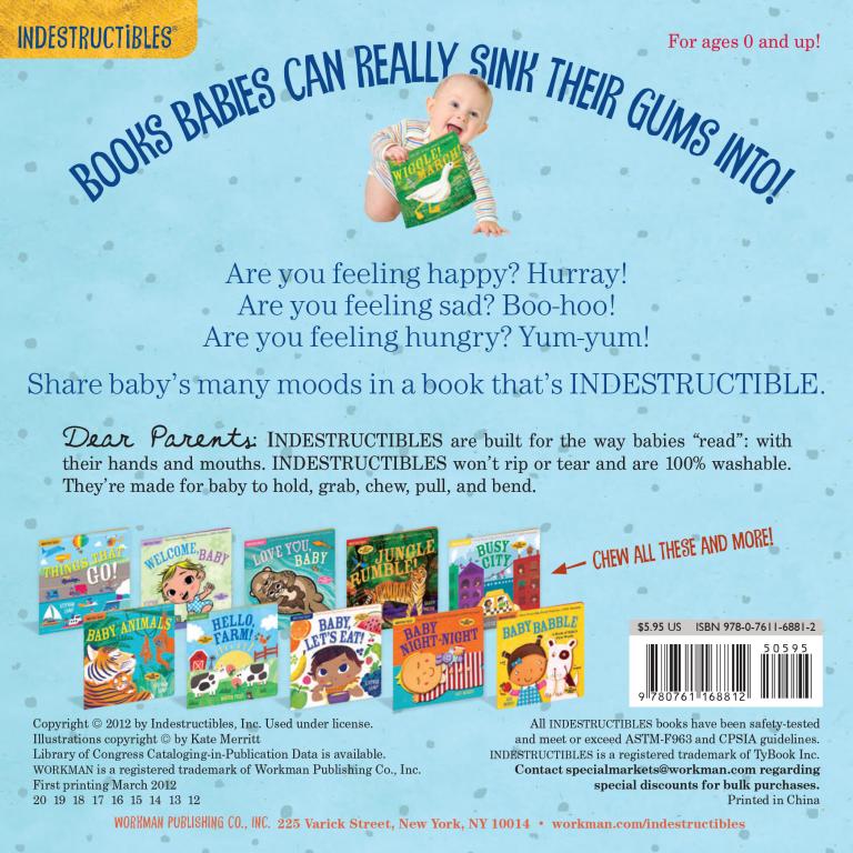 Indestructibles are the books built for the way babies read. They are 100 percent baby-proof, chew-proof, rip-proof, and drool-proof. Printed on a unique nontoxic, paperlike material that holds up to anything babies can throw at it—gumming, spilling, dragging across the floor— Indestructibles are the little books that could. They’re indestructible. And if they get dirty, just throw them in the washing machine or dishwasher.
