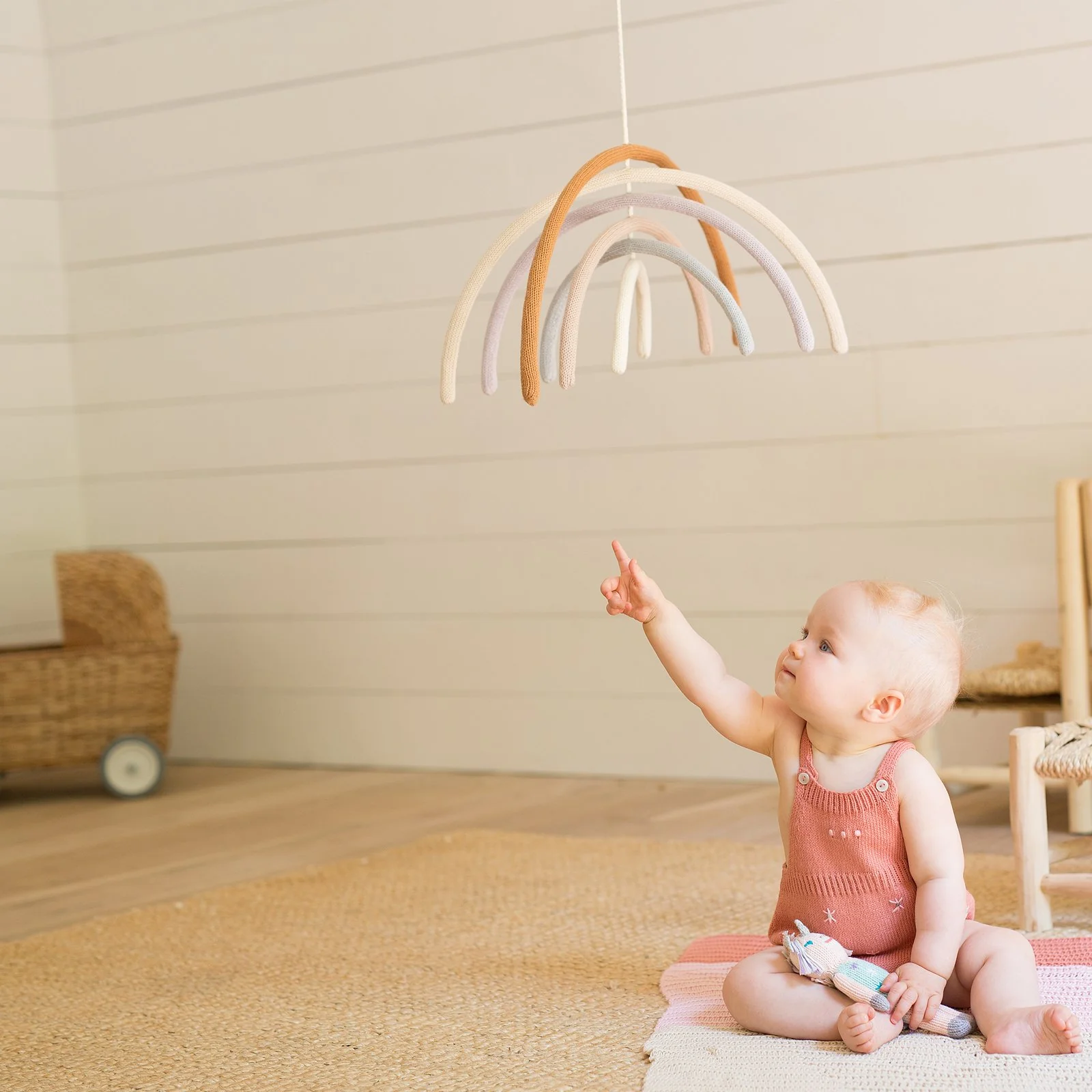 This joyful rainbow with interesting textures and gentle movement is a charmer. Suspended over a crib or on display on the wall.